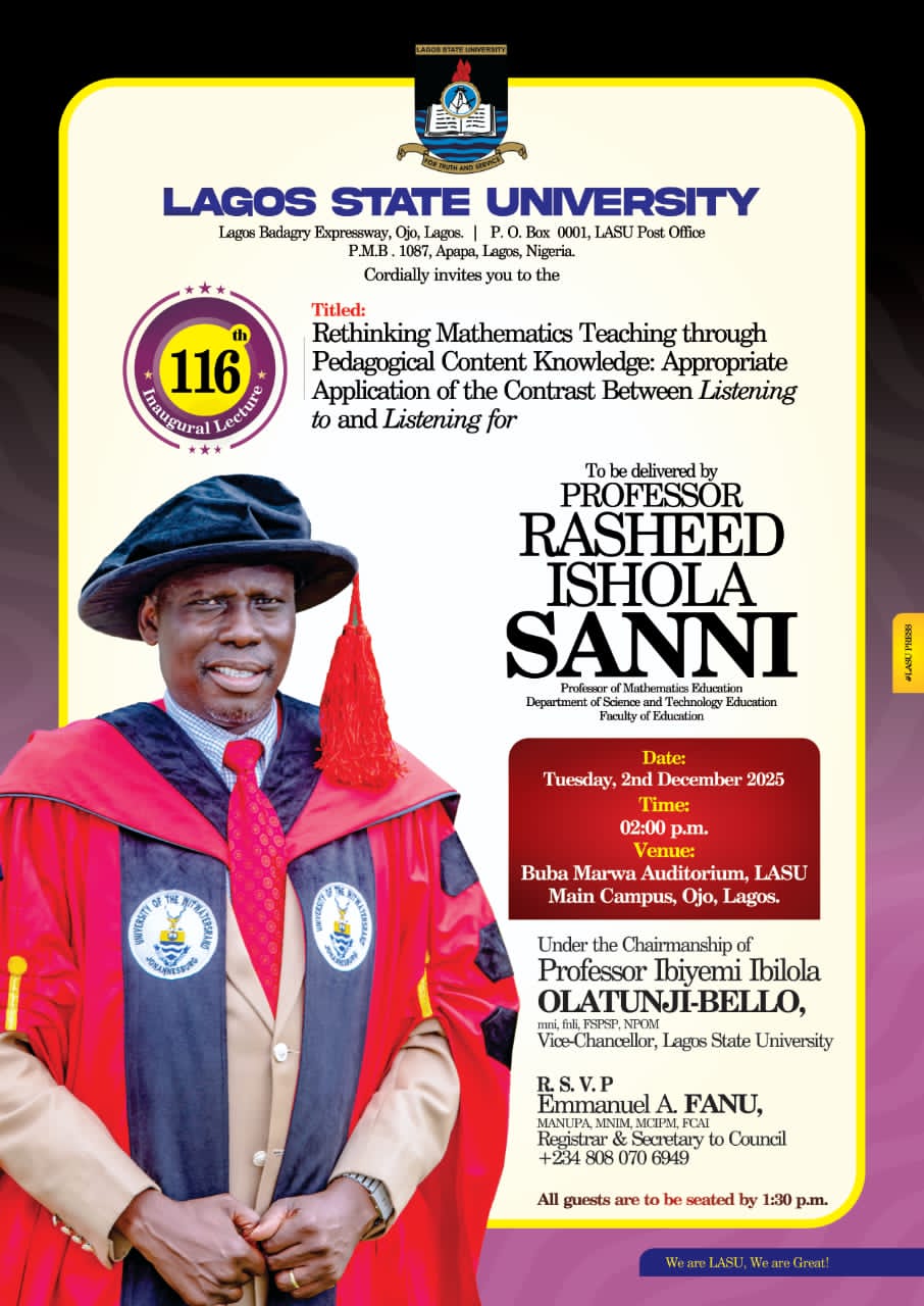 Professor Rasheed Ishola Sanni to Present LASU`s 116th Inaugural Lecture