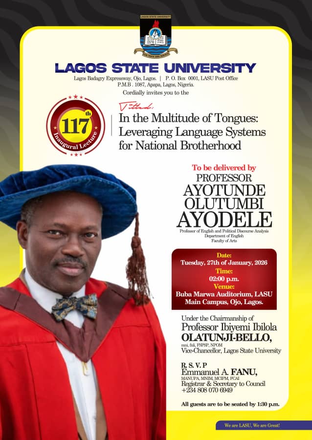 Professor Ayotunde Olutumbi Ayodele to Present LASU`s 117th Inaugural Lecture on Tuesday, 27th January 2026